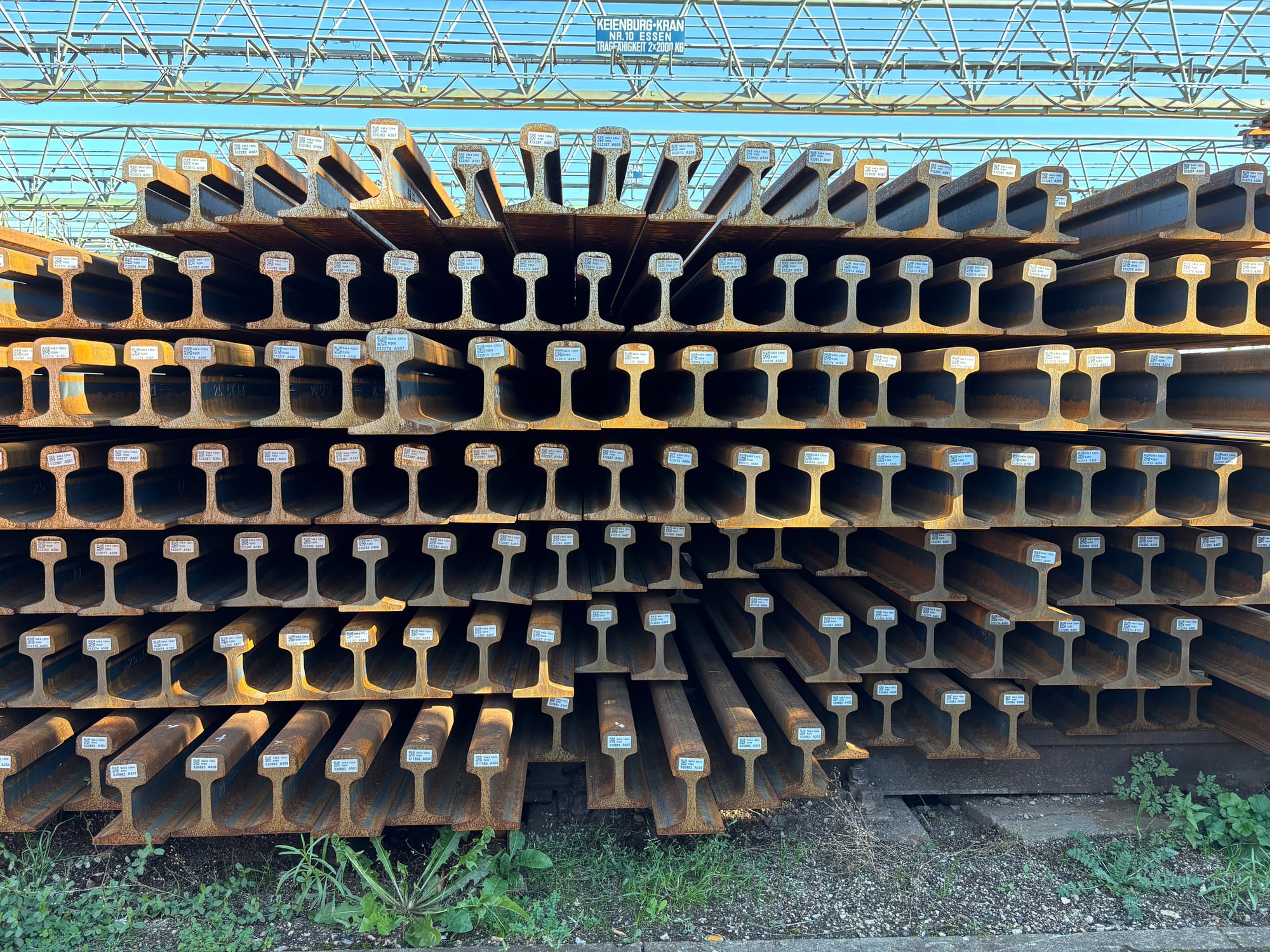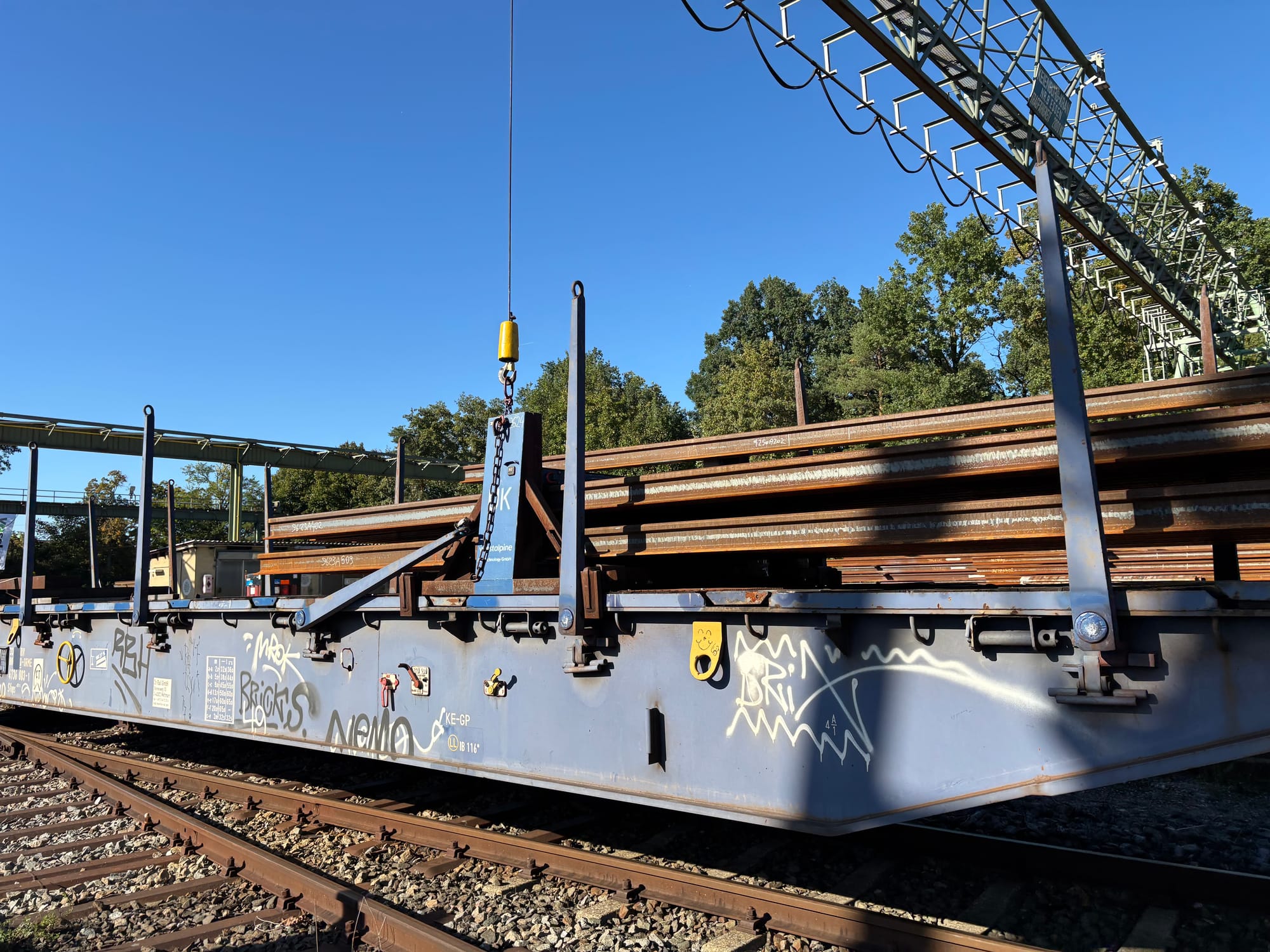 Zurück zu den Schienen. An der Schienen-Innenseite läuft also der Spurkranz entlang und außen nicht. Deshalb wird im Schienenschweißwerk auch nur die Innenseite der Schiene geschliffen und mit weißer Farbe markiert. Auf den Zug werden sie dann auch entsprechend sortiert draufgestapelt. Auf der Baustelle müssen die Schienen dann also nur noch richtig herunter genommen werden. (Andere Länder zahlen übrigens lieber mehr, damit dann beide Seiten vom Schienenkopf richtig geschliffen sind und sie keine rechten und linken Schienen haben.)