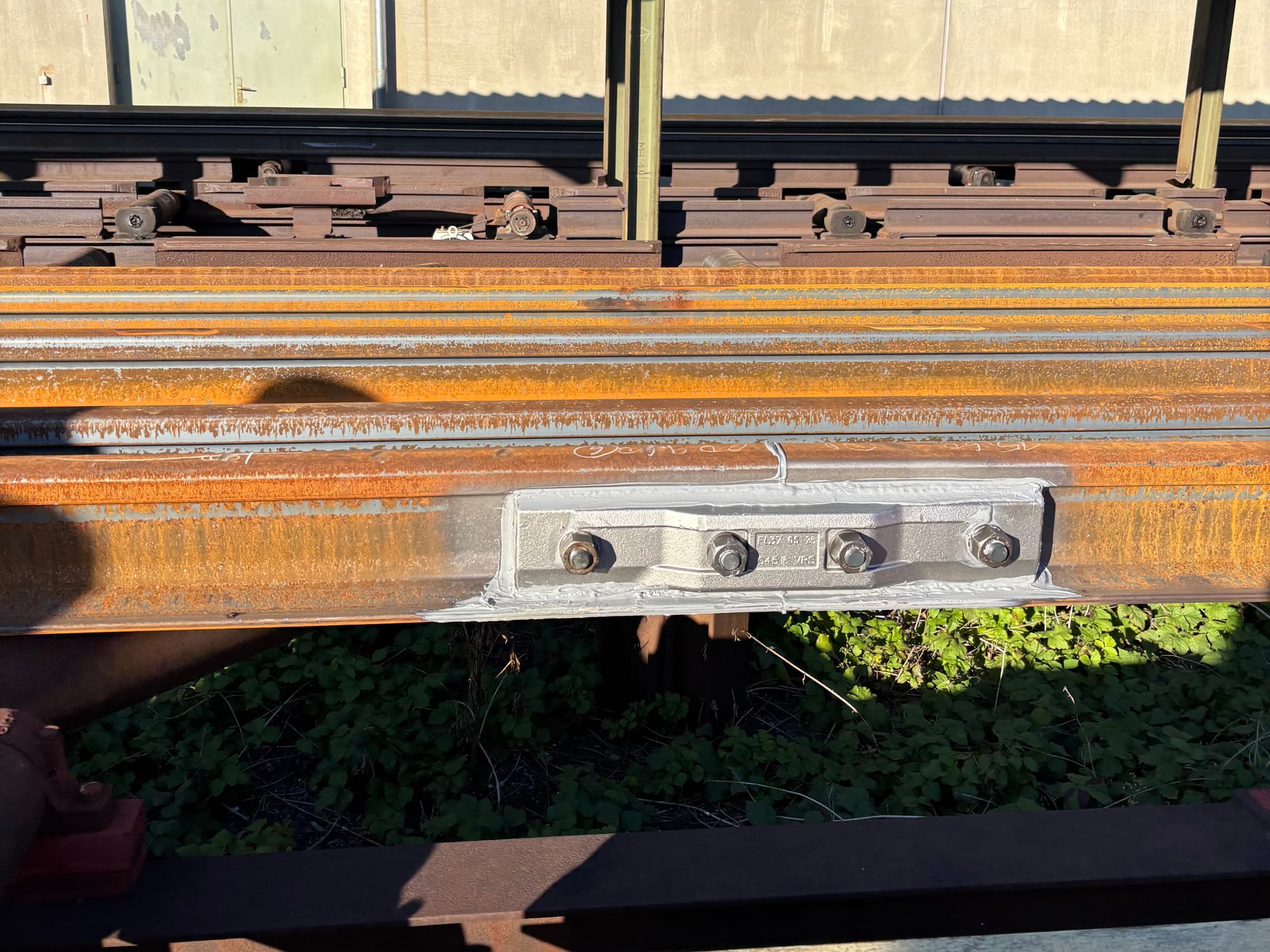 Das Schienenschweißwerk kann auch andere Dinge. Beispielsweise können sie sogenannte „Isolierstöße“ einbauen. Dafür wird das Gleis an einer beliebigen (vorgegebenen) Stelle durchgesägt, mit verschiedenen Plastik- und Vlies-Teilen isoliert und dann wieder zusammengefügt. So kann kein Strom zwischen den beiden Gleisteilen durchfließen. Warum man das braucht? Züge nehmen über die Stromabnehmer von der Oberleitung den Strom auf, verbrauchen das meiste und erden sich über die Schienen. Es fließt also immer ein bisschen Reststrom durch die Schienen ab. Das kann man sich zu Nutze machen und so messen Weichen, ob gerade Strom fließt, also ob gerade ein Zug auf ihnen ist. Wenn jetzt die Schienen alle miteinander verbunden wären, würde ja grundsätzlich ein einziger Zug auf dem Netz reichen, damit alle Weichen messen, dass ein Zug auf ihnen ist (ganz vereinfacht gesagt…) – und damit das nicht so ist, muss eine Weiche vorher und hinterher isoliert werden. Dann fließt nur Strom in der Weiche, wenn da auch wirklich ein Zug ist und die Weiche kann melden, wenn der Zug über sie drüber gefahren ist und dass man sie wieder umstellen darf. Wenn man einmal weiß, wie diese Isolierstöße aussehen, fallen sie einem irgendwie auch ständig auf – insbesondere im Weichenvorfeld eines Bahnhofs kann man einige davon entdecken. 😁