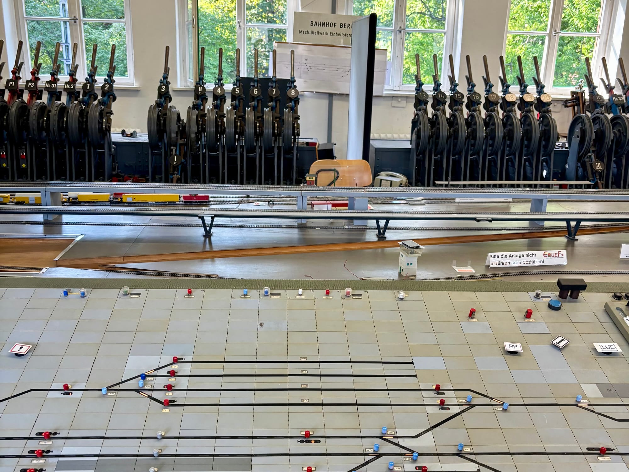 Den Rest des Wochenendes war ich schon ziemlich verplant. Aber ein kurzer Besuch im Betriebsfeld Berlin. Die Gruppe war ein bisschen komisch – mir fehlten die Eisenbahn-Nerds mit wahnsinnig spannenden Fragen… Es gab zuerst eine kleine Präsentation zum Bahnsystem allgemein und dann sind wir in das Betriebsfeld gegangen. Dort war gerade simulierter Betrieb und wir durften zuschauen. Währenddessen wurde uns die „Evolution der Stellwerke“ erklärt. Zuerst wurden Weichen vor Ort gestellt. Das brauchte natürlich viele Menschen, die dort gearbeitet haben und von Weiche zu Weiche gerannt sind. Dabei sind leider auch viele Unfälle passiert. Also wurden mechanische Stellwerke eingeführt. Sie funktionier(t)en mit Drahtzügen. Der Hebel wird umgestellt und dadurch wird der Drahtzug betätigt und die Weiche (oder auch das Formsignal) umgestellt. Weil das körperlich sehr anstrengend ist, die Hebel umzulegen, wurden elektro-mechanische Stellwerke eingeführt. Die Steuerung der Weichen und Signale ist weiterhin mechanisch, aber die Bedienung ist es nicht mehr. Später wurde dann auch die Steuerung elektrisch und wir sind beim elektronischen Stellwerk (ESTW). Die Stellwerke kannte ich schon aus Darmstadt, aber mir war neu, dass die Bahn eigentlich geplant hatte, alle Stellwerke auf ESTWs umzurüsten und deshalb mit einer kleinen dreistelligen Anzahl an nötigen Fahrdienstleitern gerechnet hat. Plot-Twist: Es gibt immer noch über 100 mechanische Stellwerke, die allein mit ca. 600 Personen bedient werden müssen. Und da sind die vielen ESTWs noch gar nicht mit dabei…